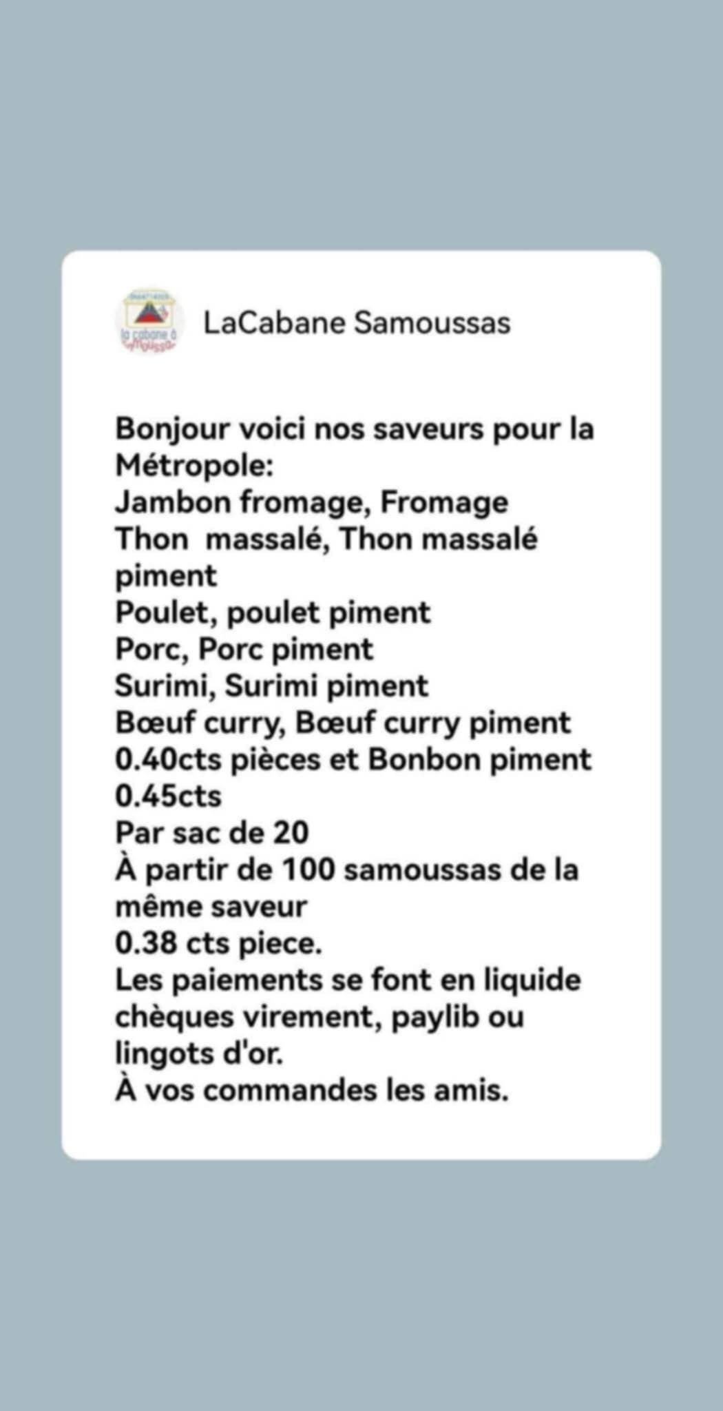 LA CABANE A SAMOUSSAS est là. Vous serez gâtés par nos friands réunionnais préparées par nos soins. Le paiement par chèque est accepté. Vous avez toujours la possibilité de payer en espèces.